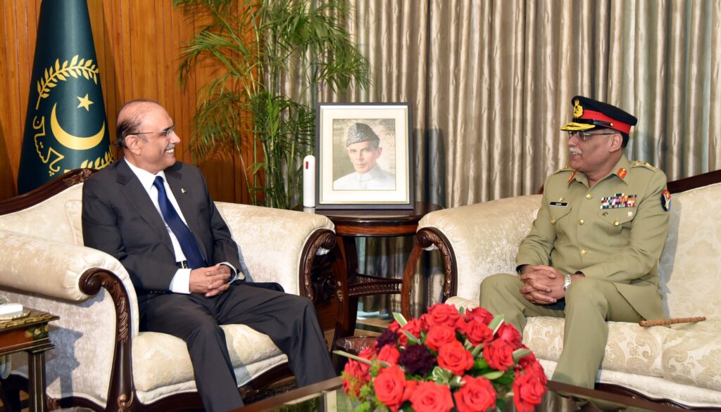 Islamabad : The Chairman Joint Chiefs of Staff Committee (CJCSC), General Sahir Shamshad Mirza, called on President Asif Ali Zardari, at Aiwan-e-Sadr. The CJCSC felicitated the President on assuming the office of the President of the Islamic Republic of Pakistan.