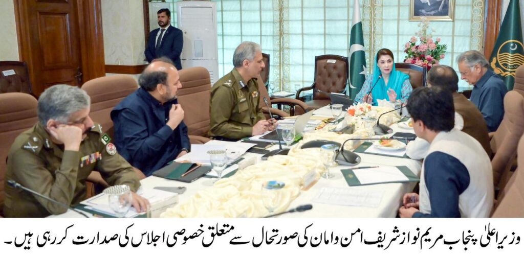 Lahore : Chief Minister Punjab Maryam Nawaz Sharif presided over a special meeting to review the overall law & order situation across the province. IG Police gave a briefing about the overall law & order situation and police performance. CM Maryam Nawaz Sharif said,” I am accountable to 13 crore people, the police should control crime and one cannot turn a blind eye to reality. I will not tolerate any no-go area anywhere in Punjab. Crime rate will have to be brought down across the province under any circumstance. If the crime rate is on the rise then the people overlook reforms and development projects of the government.The police are laying down sacrifices but black sheeps persist as well. I side with the police and stand behind the force. I expressed solidarity with the police force by donning a uniform.We are providing complete resources to the police so that their performance cannot be reduced or eroded. We are introducing an analysis and inspection system in order to evaluate police performance and elimination of corruption. 14 special checkposts are being established to stop inter-provincial smuggling. We are meeting every demand of the police force in the shape of provision of vehicles,gadgets,ammunition and training.It is our foremost responsibility to ensure protection of every police personnel standing on a checkpost. I laud the performance of IG Police, RPO Sargodha and DPO for protecting and safely evacuating 10 persons from a mob. More than 50 percent decrease in the dacoity incidents in Lahore is welcoming.The labourers being looted after taking their salaries is not only sorrowful but shameful as well. I have assigned a deadline to RPO Sheikhupura to overcome dacoity incidents.Snatching and theft incidents of sacrificial animals should be eradicated. Crackdown should continue to be undertaken on a permanent basis for the elimination of drugs.The police should undertake effective measures to stop aerial firing incidents. A road getting blocked in the presence of traffic wardens is highly regrettable. The motorbike riders should be instructed to strictly follow lane discipline on the roads. Political intervention in the police affairs has been done away with, and the police should perform now. The DPOs should purge from their respective districts corrupt police personnel and criminal elements. An effective crackdown should be launched for the eradication of electricity theft on the DG Khan model. If electricity theft is eliminated then load shedding will end as well.” The proposal to establish ‘ Beggar Barracks’ in the jails across Punjab was agreed in the meeting.