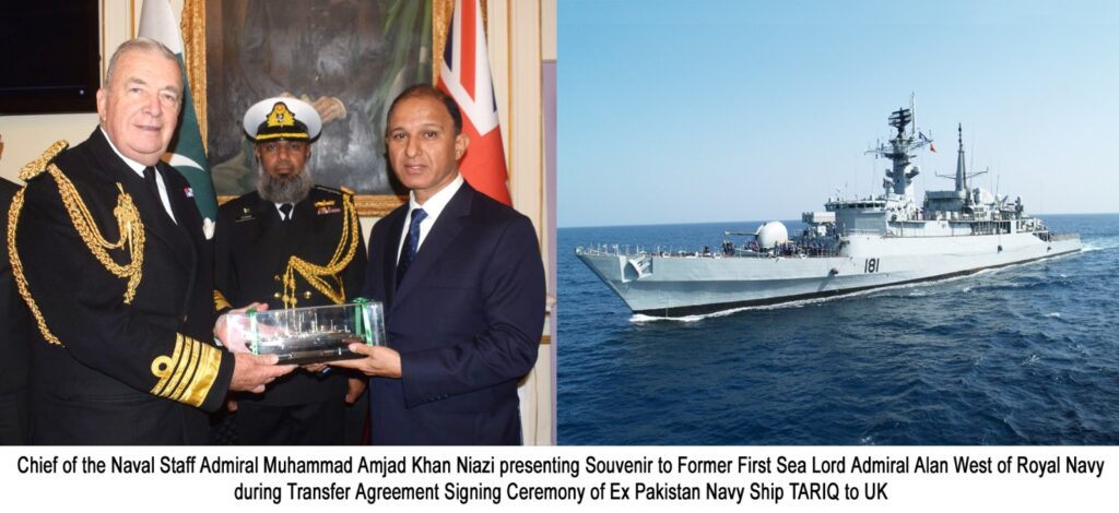 Islamabad : The Transfer Agreement Signing Ceremony for the ex-Pakistan Navy Ship TARIQ to Falls of Clyde International (FOCI) of United Kingdom was organized at Pakistan High Commission in London. Chief of the Naval Staff Admiral Muhammad Amjad Khan Niazi graced the ceremony as Chief Guest. Former First Sea Lord and Chief of the Naval Staff Royal British Navy, Admiral Lord Alan West attended the ceremony as Guest of Honour. Ex PNS TARIQ was formerly decommissioned by Pakistan Navy on 4 Aug 23 and has been gifted by the Government of Pakistan to a UK based firm Falls of Clyde International (FOCI) that plans to convert the ship into a floating museum. The ship will be on static display at Clyde Maritime Heritage Centre in Glasgow as a symbol of common naval heritage of the Royal and Pakistan navies.