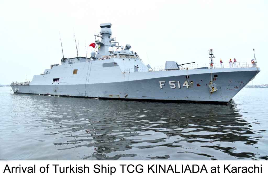 Karachi : Turkish Navy Ship TCG KINALIADA (F-514) arrived Karachi for a good will visit. The ship was received by Pakistan Navy Ship at sea and later welcomed at Karachi port by senior Pakistan Navy officials along with diplomatic staff of Turkish Consulate.