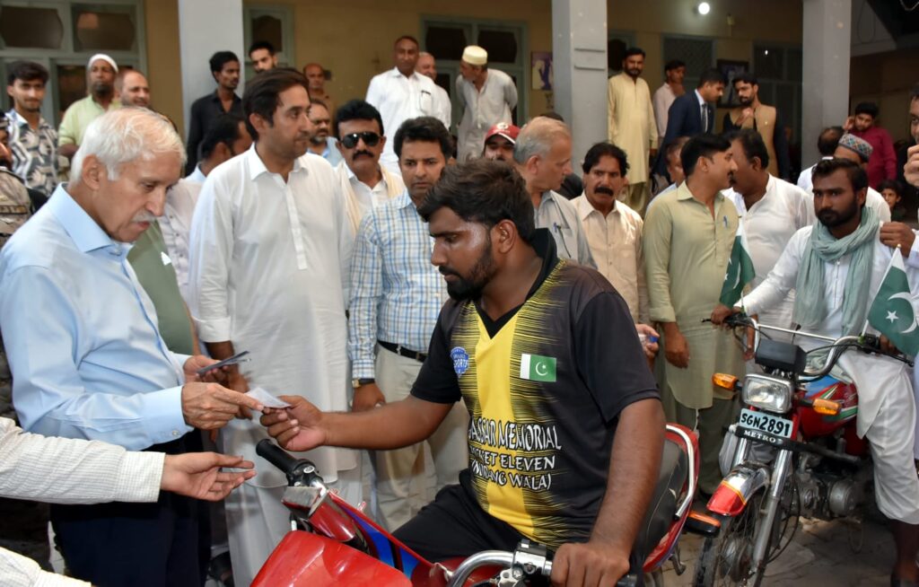Chiniot :- Federal Minister for Maritime Affairs, Qaiser Ahmed Sheikh, stated that under the leadership of Prime Minister Shahbaz Sharif, the government is working hard to provide relief to the public. He emphasized that the only way to move the country forward is through public service and hard work. Therefore, all resources are being utilized to ensure that relief for the public begins soon. He was speaking at a ceremony in Chiniot, where he distributed free petrol worth 10 million rupees from his own pocket to 10,000 motorcyclists and rickshaw drivers on Pakistan’s Independence Day.