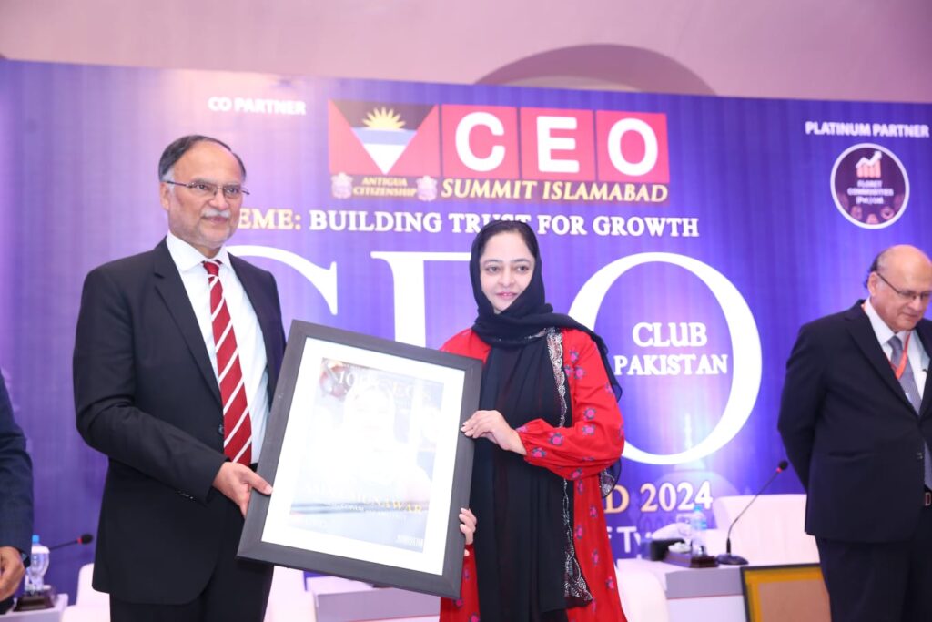 CEO Club Pakistan congratulates to Ms. Amna Munawar Awan (President Center of Pakistan and International Relations – COPAIR) received a souvenir by the Federal Minster during the CEO Summit, to appreciate and recognize the tireless efforts and outstanding leadership of Pakistani CEOs diaspora who have significantly contributed to the country’s development through its highly professional, innovative, and dynamic approach, has been creating a momentous impact in the country.