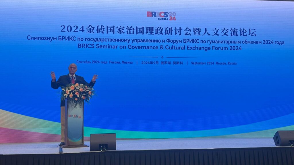Moscow : Senator Mushahid Hussain Sayed said ‘Pakistan looks forward to joining BRICS’ & welcomed ‘winds of change blowing all across South Asia which reject hegemony, status quo & seek change’, referring to recent radical changes in the Maldives, Nepal, Bangladesh and Sri Lanka. As a consequence, he said the so-called ‘Indo-Pacific Strategy is now drowning in the waters of the Indian Ocean’. He criticised the recent US sanctions against Pakistan and China, terming these ‘immoral, unjust, unacceptable and illegal’ as sanctions under International Law can only be imposed by the UN Security Council. He Alsó condemned ‘Western hypocrisy and double standards on Palestine’. Senator Mushahid Hussain said the Global Order was marked by turbulence and transformation, with two contrasting narratives. China and Global South are focused on connectivity and trade and economic cooperation, conversely, the US is busy with pushing a New Cold War with a militaristic mindset, evident in yesterday’s QUAD meeting hosted by President Biden, where he again showed his China-obsession. Senator Mushahid Hussain urged the BRICS Seminar to define a new narrative based on emerging ground realities to counter propaganda, fake news and disinformation. For the future, Mushahid put forward a 3-D Strategy for BRICS: Democratisation of the world order based on multipolarity, multilateralism, UN Charter and International Law, Demilitarisation of international relations, rejecting any new military alliances like ‘Asian NATO’, QUAD or AUKUS, Dedollarisation of the world economy and greater trade in non-dollar currencies as dollar was being weaponised. Senator Mushahid Hussain was warmly welcomed by the host, Mikhail Shvydkoy, Special Envoy of President Putin, as well China’s Minister for International Communication, Wang Gang. Apart from Russia and China, other countries represented at BRICS Seminar included India, Brazil, South Africa, Egypt, Iran and UAE. Senator Mushahid Hussain was the only representative from a non-BRICS member state.