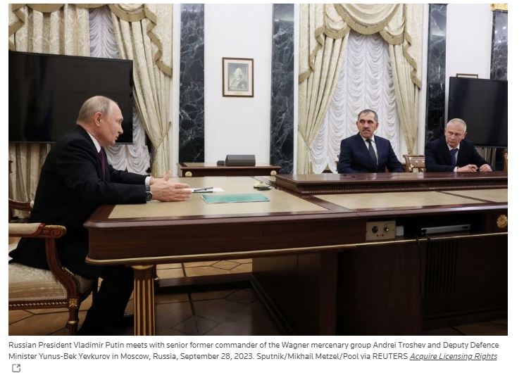 Russian President Vladimir Putin met with Andrei Troshev, a former senior commander of the Wagner mercenary group, to discuss the utilization of “volunteer units” in the Ukraine conflict. The meeting, which took place at the Kremlin, was aimed at demonstrating the Russian government’s control over the mercenary group following a failed mutiny by its leader, Yevgeny Prigozhin, in June, who was subsequently killed in a plane crash in August, along with other high-ranking commanders.