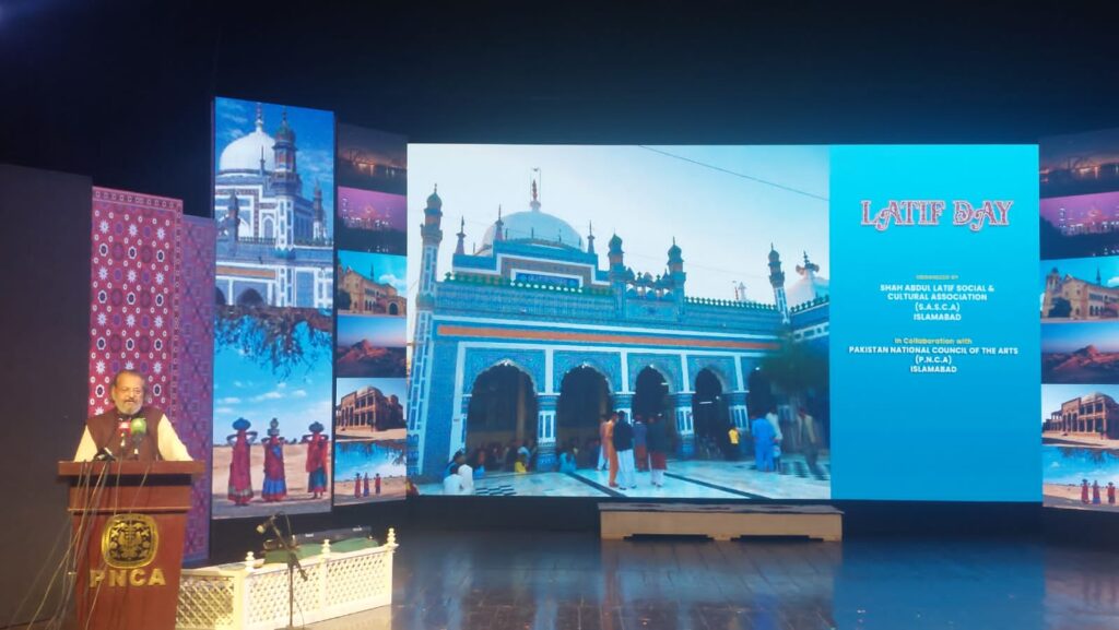 Islamabad : Pakistan National Council of the Arts (PNCA) in collaboration with Shah Abdul Latif Social and Cultural Association (SASCA) arranged the “Latif Day” in connection with Urs Mubarak of Shah Abdul Latif bhitai, which included music and folk dances. Programme started with recitation of holy quran followed by speeches by Federal minister Madad Ali Sindhi and Sajada Nishin of Hazrat Lal Shahbaz Qalanadar Mr. Syed Mehdi Raza Shah Sabzwari. A documentary was also presented on the life history of Shah Abdul latif bhittai and their contribution for poetry, music, nature, and humanity. Sumaira Alif, Sarshar Peyara, and Aown Ghulam Ali presented Sindhi music to entertain the audiences to showcased Sindhi music, and musicians also highlighted the value of the rich cultural heritage of the sindh .Along with this, the NPAG group of PNCA also presented Bhanghra, Sindhi Jhoomar, Dhamaal, etc.