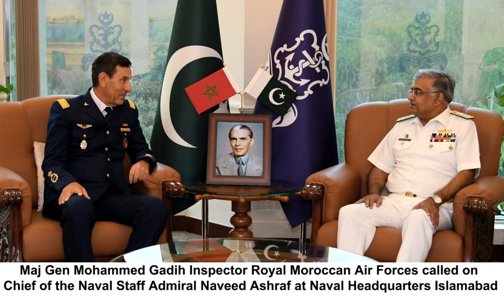 Islamabad : Inspector of the Royal Moroccan Air Force, Major General Mohammed Gadih, called on the Chief of the Naval Staff, Admiral Naveed Ashraf, at Naval Headquarters. During the meeting; professional matters of mutual interest including bilateral collaboration and regional maritime security, were discussed.