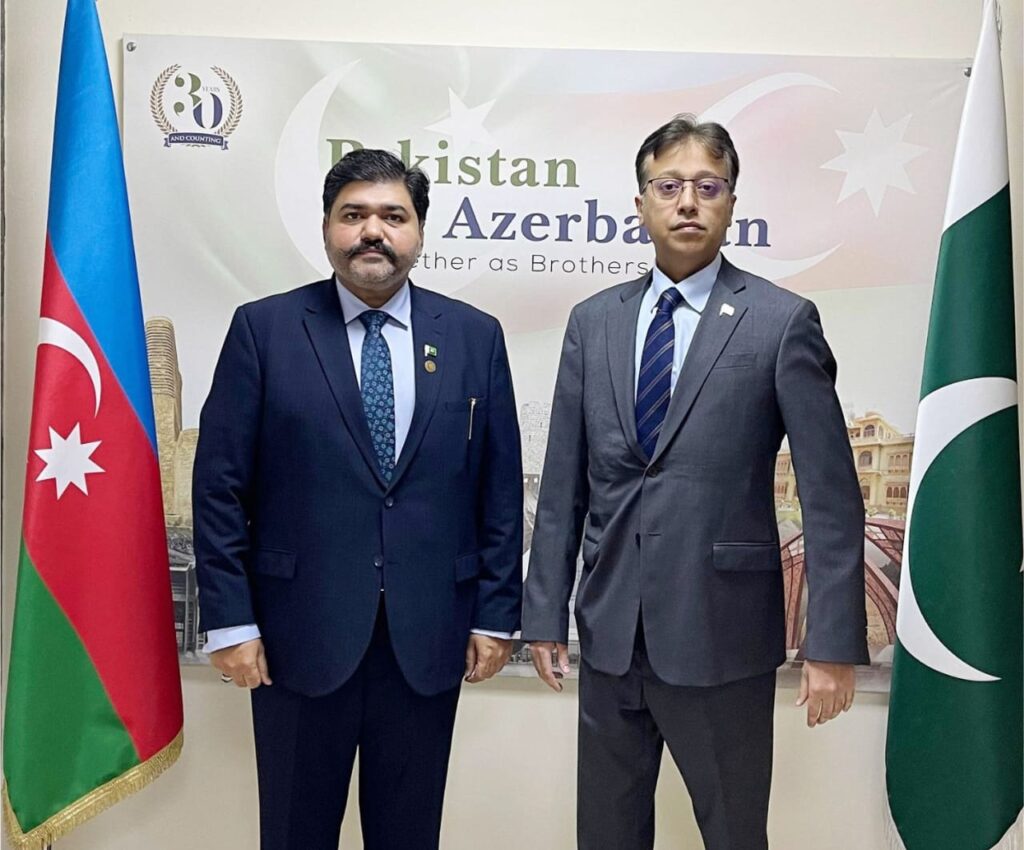 Baku : Chairman Pakistan Red Crescent Society (PRCS), Sardar Shahid Ahmed Laghari, held a productive meeting with His Excellency Mr. Qasim Mohiuuddin, Pakistan’s Ambassador to Azerbaijan, at the Pakistani Embassy in Baku. The meeting occurred on the sidelines of the 29th Conference of the Parties (CoP29) and focused on strengthening humanitarian efforts and addressing climate change challenges.