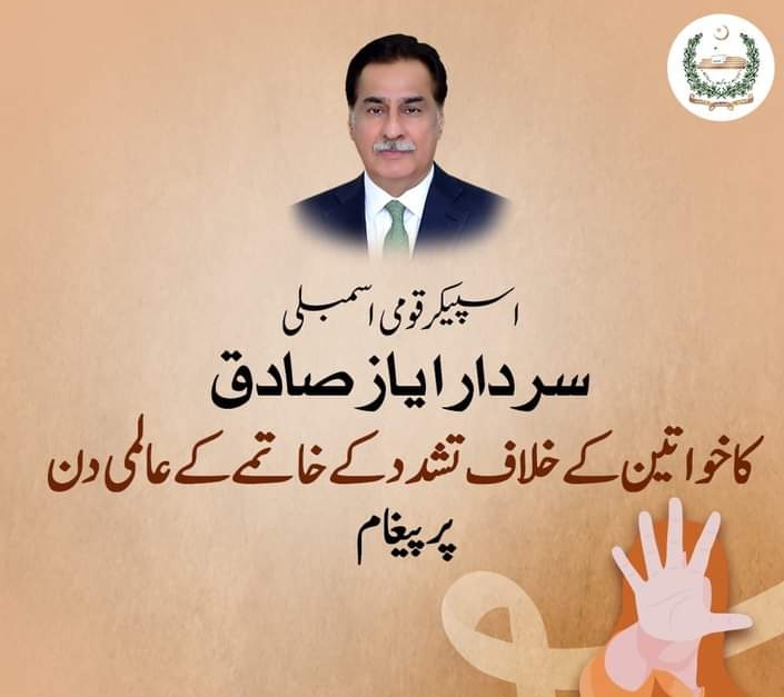 Islamabad ; Speaker of the National Assembly of Pakistan, Sardar Ayaz Sadiq underscored the significance of ensuring and providing safety to women from all forms of physical violence, psychological harm & exploitation. He emphasized that the safety and dignity of women must be upheld in all spheres of life, including workplaces, public spaces, and online spaces. He urged the public at large to collectively take responsibility in ensuring the safety of women as relatives, colleagues, and fellow citizens. NA Speaker also mentioned the exemplary teachings of the Holy Prophet Muhammad (PBUH) for uplifting and preserving the rights of women as relatives and valuable members of the society for the first time ever in human history. He expressed these views on the eve of the International Day for the Elimination of Violence Against Women, celebrated annually on November 25 under the auspices of the United Nations.