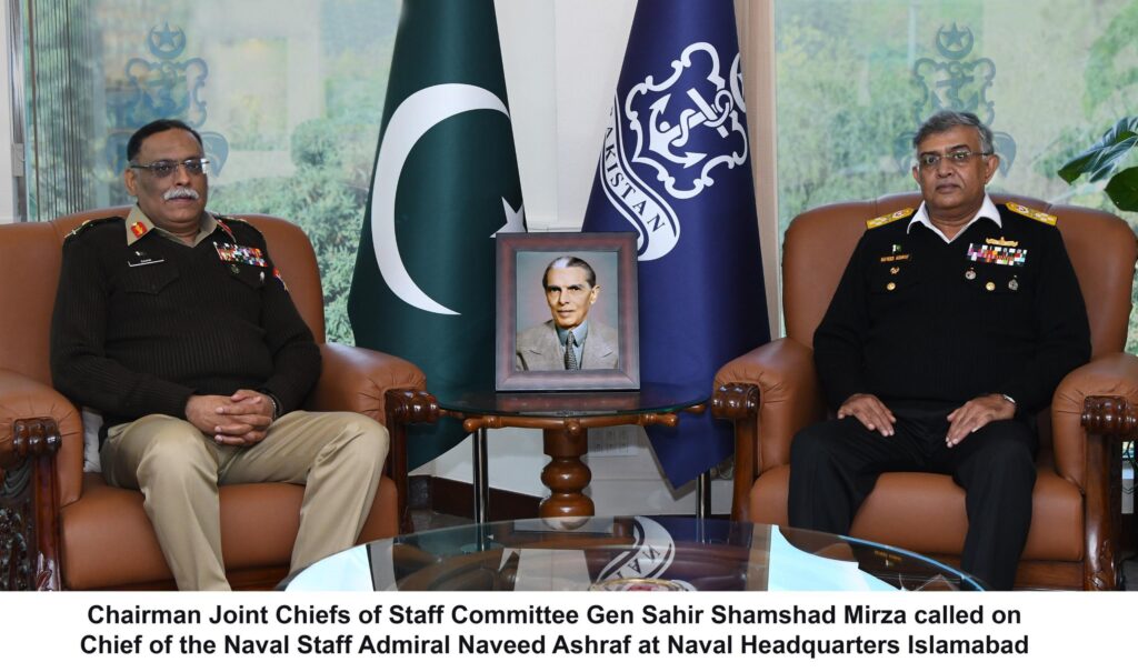 Islamabad : Chairman Joint Chiefs of Staff Committee General Sahir Shamshad Mirza visited Naval Headquarters Islamabad and met Chief of the Naval Staff Admiral Naveed Ashraf. Matters of mutual interest, contemporary geo-political situation and emerging maritime security challenges were discussed during the meeting. General Sahir Shamshad Mirza appreciated the role of Pakistan Navy in ensuring maritime security in the region.