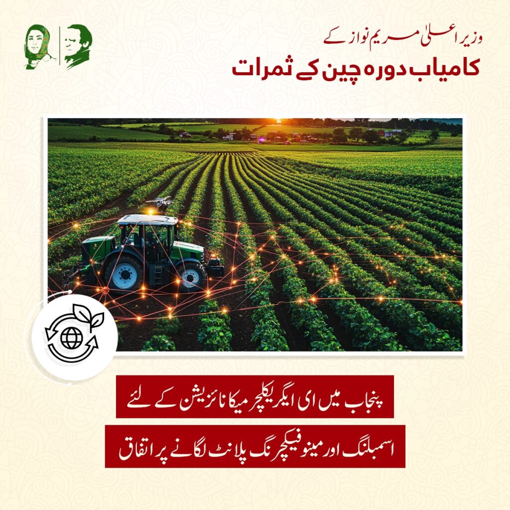 The Chief Minister during her visit to China along with a delegation witnessed robotic farming and other e-machinery. She invited renowned AI Force Tech to visit Punjab for e-agriculture machinery. The Chief Minister achieved unprecedented success in attracting foreign investment while advancing the vision of PML-N.