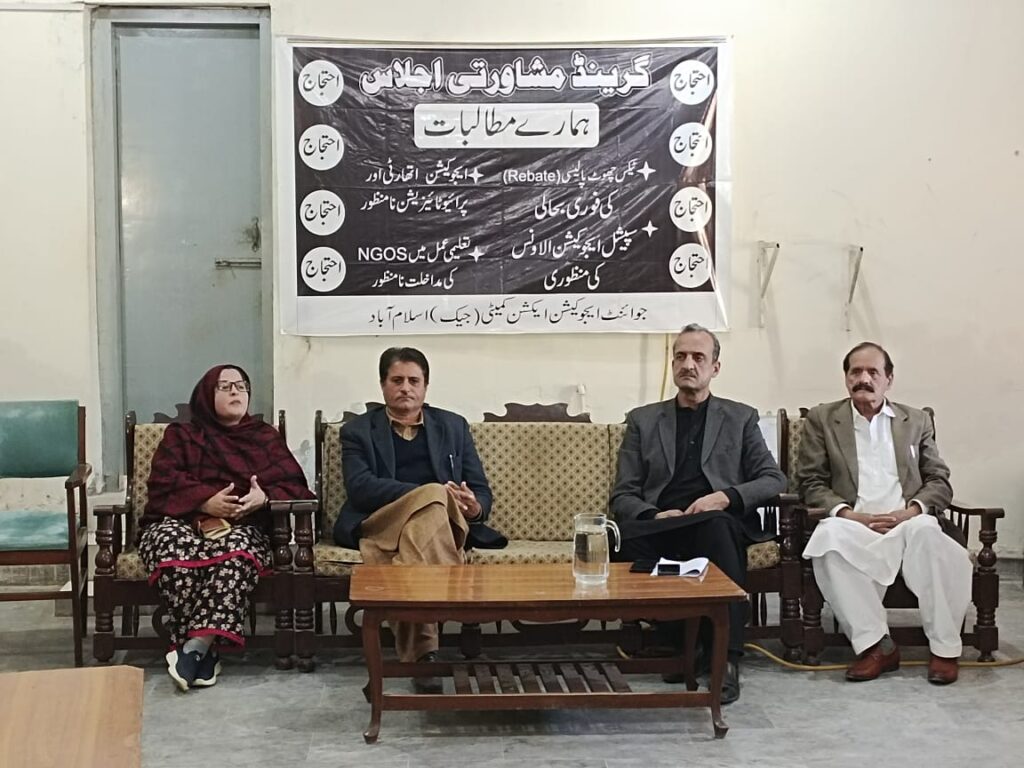 A meeting of representatives from universities, colleges, and schools associations was held today under the chairmanship of Mr. Fazal Mola, Chairman of the Joint Education Action Committee (JEAC). The meeting was attended by all JEAC members as well as Mr. Ashfaq Ahmad from Islamic and Barani Universities, Ms. Saadia Masood, Ms. Rahima Rehman, Mr. Tahir Bhatti, Mr. Rashid Khan, Mr. Mateen Ahmad, Mr. Danish Yaseen, Dr. Aman Ullah (College of Education), Mr. Sadaqat Abbasi, principals of schools, teachers’ leaders, and other individuals.