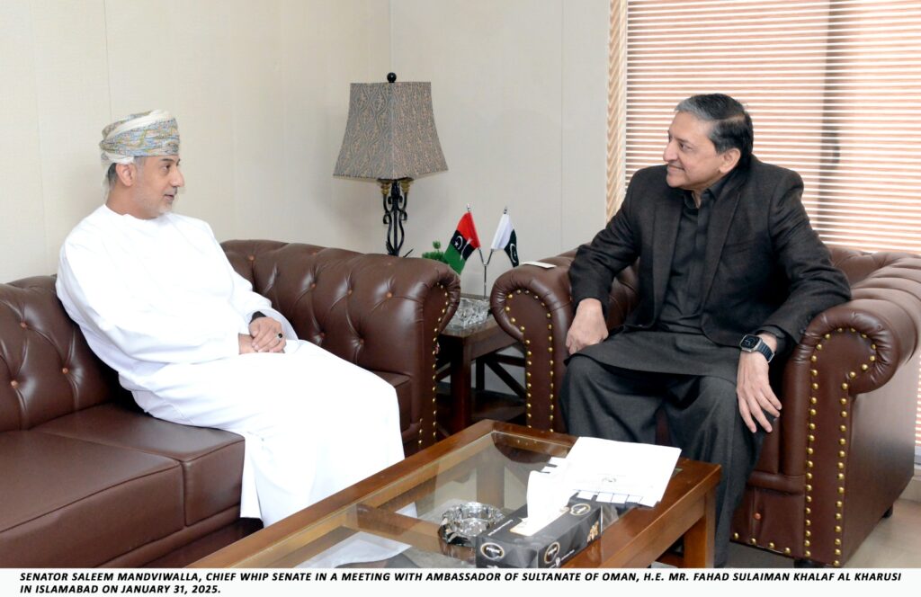 Islamabad: Chief Whip Senate, Senator Saleem Mandviwalla, met today with the Ambassador of the Sultanate of Oman to Pakistan, Mr. Fahad Sulaiman Khalaf Al Kharusi, at Senate Secretariat p. The meeting, focused on strengthening the long-standing brotherly ties between Pakistan and Oman, with a particular emphasis on enhancing bilateral trade and economic cooperation.