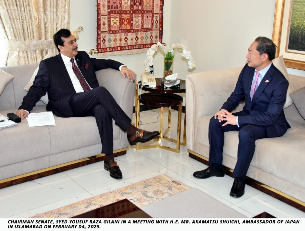 Islamabad: Syed Yousaf Raza Gilani, Chairman of the Senate of Pakistan, reaffirmed Pakistan’s commitment to strengthening its ties with Japan and expanding cooperation in multiple sectors for the mutual benefit of both nations. He made these remarks during a meeting with Akamatsu Shuichi, Ambassador of Japan.