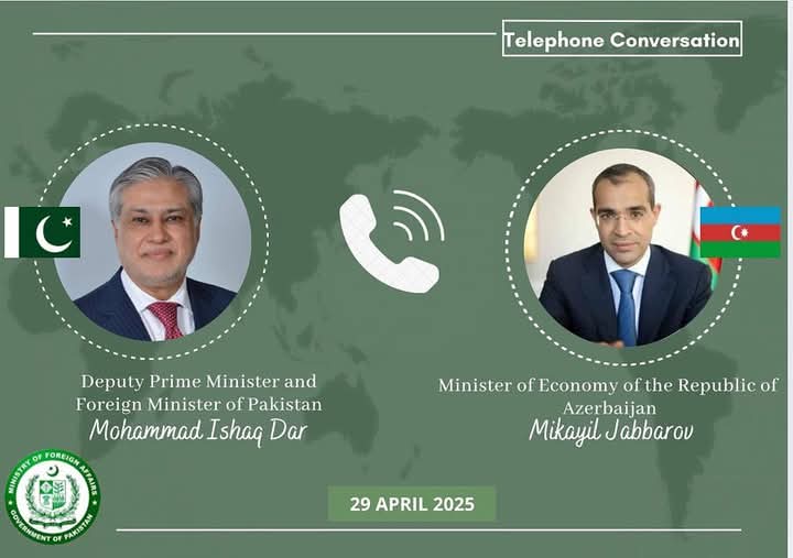 Islamabad : Deputy Prime Minister and Foreign Minister Ishaq Dar held a telephone conversation with Azerbaijan’s Minister of Economy, Mikkayil Jabbarov.