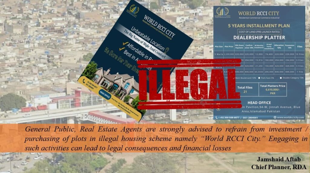 RAWALPINDI : On the directions of the Director General, Rawalpindi Development Authority (RDA), Muhammad Saif Anwar Jappa, the Metropolitan Planning and Traffic Engineering (MP&TE) Directorate RDA has issued notice to the owner of illegal housing scheme Dr. Yasir Mahmood Chohan, CEO of “World RCCI City” in Rawalpindi for cheating / misleading the general public, RDA spokesman said.