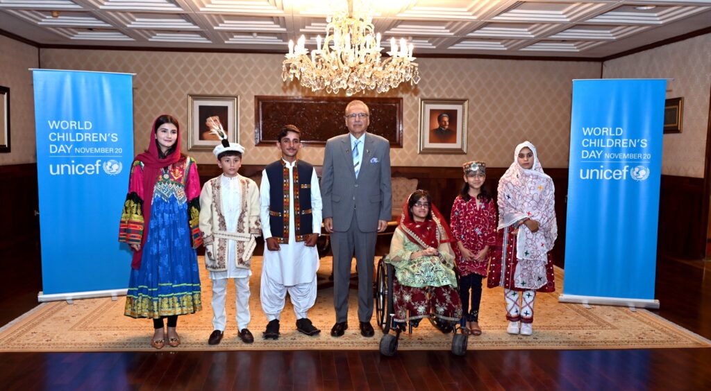 Islamabad : In connection with World Children’s Day, a delegation of children representing four provinces, as well as, Gilgit Baltistan and Azad Jammu and Kashmir, nominated by the United Nations Children’s Fund (UNICEF), called on President Dr Arif Alvi. The delegation was led by UNICEF’s first-ever Youth Advocate in Pakistan, sixteen-year-old, Ms. Taqwa Ahmad.