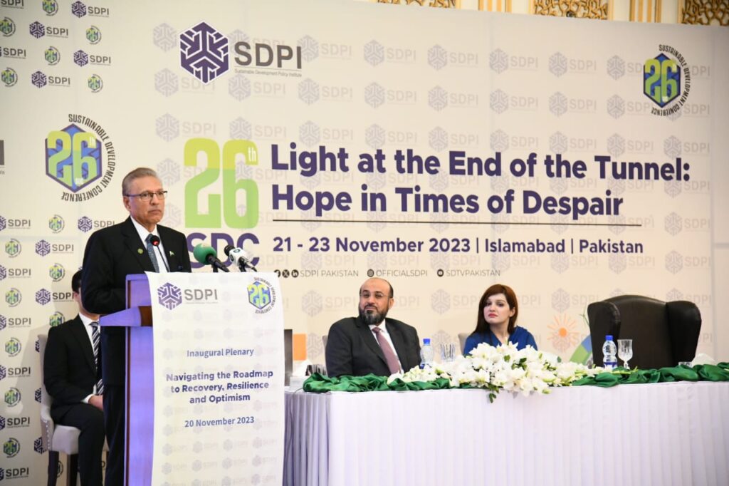 ISLAMABAD : President Dr Arif Alvi on Monday reiterated his call for a world order characterized by the participation of the populace and steadfast adherence to moral principles to serve as the cornerstones for ensuring enduring peace and sustainable development. The president, addressing the inaugural plenary titled “Navigating the Road to Recovery, Resilience and Optimism” under the 26th Sustainable Development Conference held by the Sustainable Development Policy Institute (SDPI), highlighted the shortcomings of the Westphalian model in the establishment of peace and also questioned the world’s double standards to deal with the conflicts.The theme of the three-day conference is “Light at the End of the Tunnel: Hope in Times of Despair”. The president told the gathering of diplomats, think tanks, researchers and academia that the world had spent around $10 trillion of the taxpayers’ money on the “weapons of mutual destruction” which reflected the priorities of the people. He said instead just $1 trillion of the said money was enough to address the challenges of poverty and illiteracy while highlighting that around 27 million children in Pakistan were yet out of school. Rejecting the justifications for the ongoing war in Gaza, he said the war had never been the solution to the conflicts and that peace was inevitable for sustainable development. He also questioned whether the killings in Gaza would make the suffering people think for peace or have a reaction. He said unfortunately the vested interests had overridden the rules. Coming to the modern-day challenges, President Alvi said unlike the nuclear bombs, dealt by the states, modern ear tools like artificial intelligence had individual control that could have far-reaching impacts. He said human intellectual development was going faster than its ability to use the available technological tools. President Alvi said that considering its exponential change, he had pinned hopes on the human intellect as currently, humans with even simple and basic knowledge were making a difference. Earlier in her address, Special Assistant to PM on Human Rights and Women Empowerment Mushaal Mullick said sustainable development and women were intertwined as women played the role of catalyst for change. Emphasizing women’s political and financial inclusion, she urged the government and non-government organisations to address the hindrances in the progress. She said as women were instrumental in sustainable development, their education and empowerment were a must to achieve the desired results. In his address, SDPI Executive Director Abid Qayyum Sulehri said the three-day moot was being attended by over 200 speakers from 19 countries including Australia, Bangladesh, Canada, China, Germany, Italy, India, Kenya, Nepal, Norway, Qatar, Thailand, Pakistan, Philippines, Singapore, Sri Lanka, Switzerland, the UK and the USA. He said over the next three days, delegates of the Conference would be discussing the way forward in these tumultuous times of political and economic turmoil, marked by uncertainty and despair due to multiple crises, climate change, and the ongoing conflicts in different regions of the world. Director General, Islamic Organization for Food Security; and Director, Food Security Department, Ministry of Municipality and Environment, State of Qatar Dr Masoud Jarallah Al-Marri also addressed the conference and highlighted the Organization’s role and commitment for food security and sustainable development.