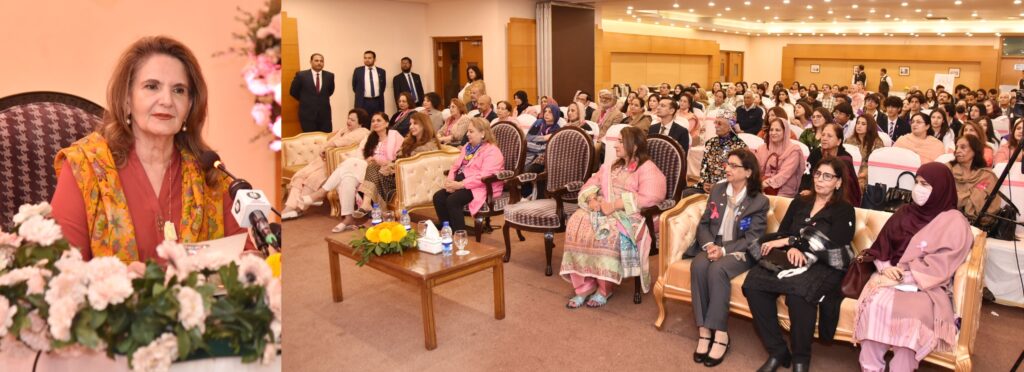 Islamabad : Begum Samina Alvi, wife of the president of Pakistan emphasized the need for collective efforts in raising awareness about breast cancer, mental health and well-being, as well as advocating for the rights of persons with disabilities to enable them becoming productive part of the society. “These topics should be openly discussed throughout the year, whether it is breast cancer, rights of differently abled person or mental health,” she said while speaking at an awareness seminar on breast cancer organized by the Rotary Club here. “In this regard, we will need the support of not only the government but also the society as a whole,” she said adding that there was need to work for increasing the existing facilities in Pakistan. The first lady said that a five-minute self-examination every month could help detect breast cancer at an early stage, thus saving thousands of the lives of women in the country.She said that 44,000 deaths due to breast cancer in Pakistan was an alarming situation that needed raising constant awareness about early diagnosis of the disease.Samina Alvi mentioned that the world overall had a 98 percent recovery rate from breast cancer, however, pointed out that in Pakistan, insufficient mammographic facilities led to a high mortality rate due to the detection of malignancy at a late stage.She said that women of all ages including teenage girls of 12-14 years were also being diagnosed with breast cancer.She urged the women and girls to learn the five-minute routine of self-examination and spread the word among at least 20 other women folks in their circle. She also got a pledge from all the participants to spread her message for the importance of mental health and rights of persons with disabilities. She said that with regard to the mental health, a mobile app “Humraaz” was being developed through with the people could seek guidance about their mental health. She said that 24 percent of the total population was suffering from mental health problems but the number of related health professionals and psychiatrists was very low that needed to increased. She called for accommodating the differently-abled persons with facilities of education and employment for mainstreaming them in the society.Oncologist Dr Fozia on the occasion, informed that 99 percent breast cancer patients with detection at first stage survived while the survival rate among the patients with detection at second stage was 95 percent and that of third stage was 86 percent. However, she said that the rate for the fourth stage patients was significantly dropped to 28 percent. She said that the global rate of detection at stage 4 was 6 percent while in Pakistan it was 19 percent. She said that the oncology team was committed to convey the message of self examination to the women in every corner of the country. On the occasion, cancer survivors Mahru Arif Ali from Rotary Club and Professor Shama Sikandar also shared their experiences of breast cancer.