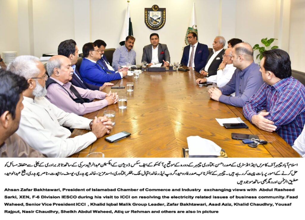 Islamabad : Ahsan Zafar Bakhtawari, President of Islamabad Chamber of Commerce and Industry (ICCI) said that open and hanging electric wires in the markets always pose great danger to the shopkeepers, while fire incidents due to short circuit of electricity cause loss of millions of rupees to the plaza owners as well as the shopkeepers. Therefore, IESCO should address this issue on priority to save the traders from further losses. He said that 5,000 traders are doing business in the Blue Area, but there have been fire incidents 6 to 7 times due to the short circuit of electricity in this biggest commercial center of Islamabad, which have caused huge losses to the business community, so ISCO should develop its infrastructure on modern lines besides improving the wiring system in all markets. He said this while talking to while talking to Abdul Rasheed Sarki, XEN, F-6 Division of IESCO during his visit to ICCI.