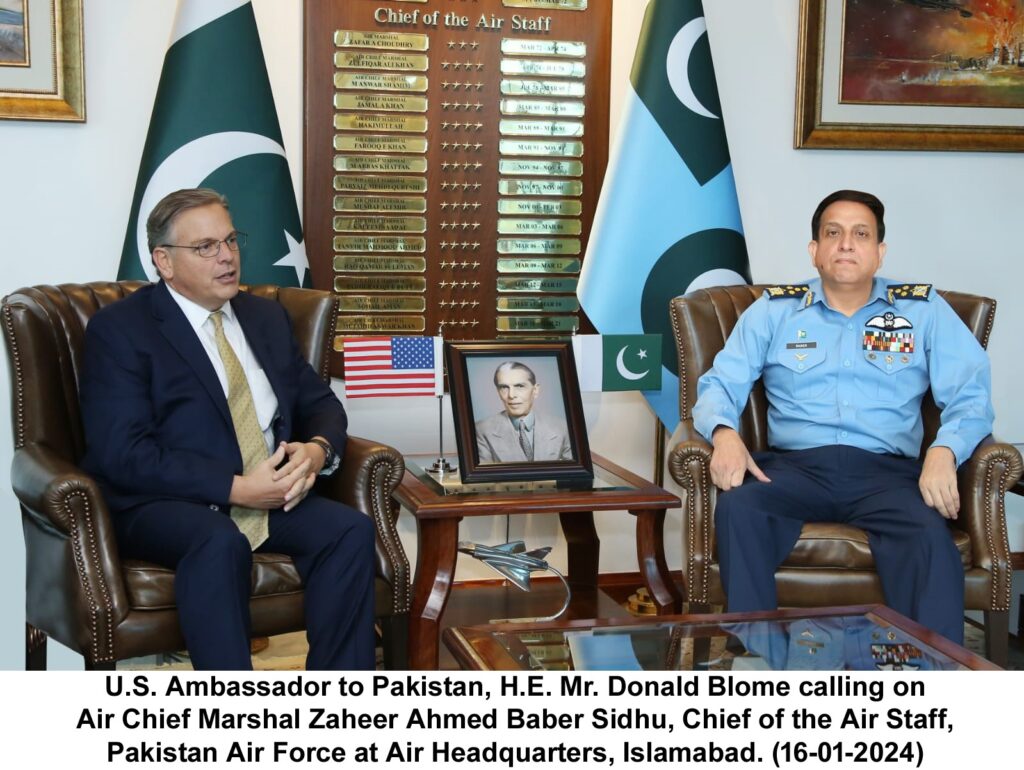 Islamabad : U.S. Ambassador to Pakistan H.E. Mr. Donald Blome called on Air Chief Marshal Zaheer Ahmed Baber Sidhu, Chief of the Air Staff, Pakistan Air Force. During the meeting, both dignitaries expressed their mutual desire to elevate the training momentum between the two sides through enhanced collaboration in air force to air force mutual exercises. Furthermore, they emphasized the importance of fostering a robust exchange of delegations and knowledge sharing to bolster the capabilities of both the PAF and the US Air Force. The discussion also centered around collaboration in the recently established techno parks, with a focus on leveraging technological advancements to enhance operational effectiveness and efficiency. The reorganization of mutual cooperation parameters was also deliberated upon, with an aim to fortify existing ties and explore new avenues for joint ventures and strategic partnerships.