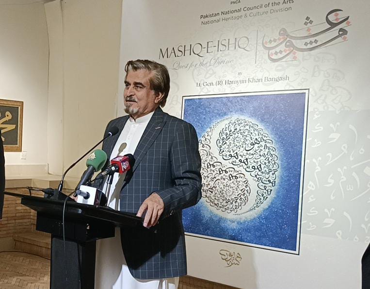 “After assuming the charge of Federal Minister for NH&CD, I took the initiative to request PNCA to organize an exhibition featuring Gen. Humayun Bangash’s beautiful calligraphic paintings. I express my heartfelt gratitude to Mr. Ayoub Jamali, the Director General of PNCA, and the artist for their collaboration, making this exhibition a reality,” said Mr. Jamal Shah.
