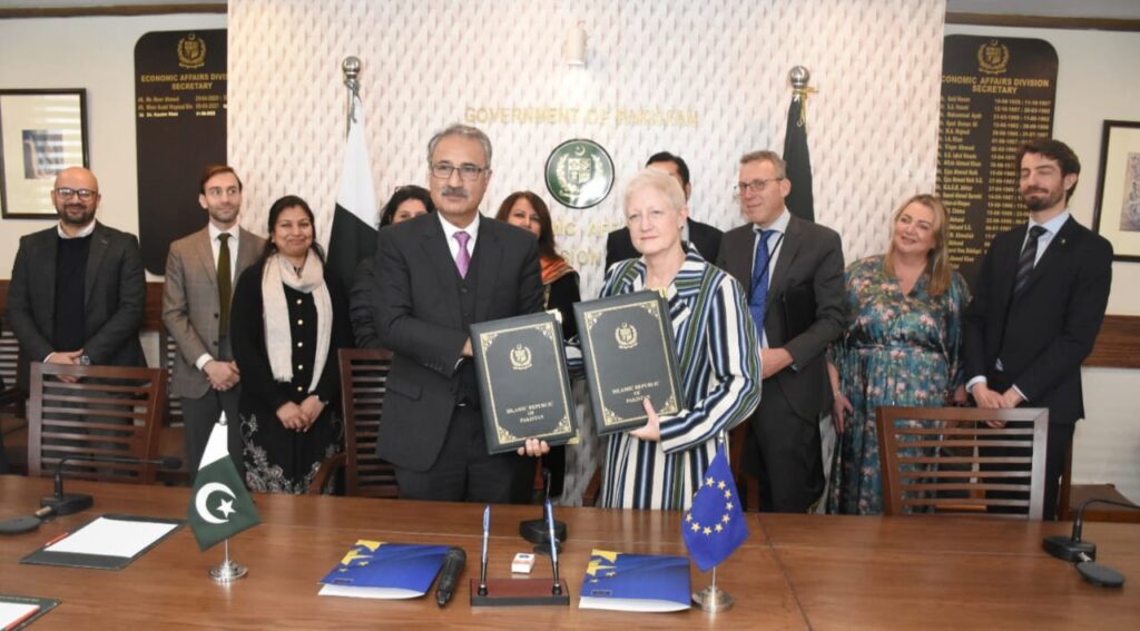 Islamabad : The European Union (EU) Ambassador to Pakistan, Ms. Riina Kionka, and Dr. Kazim Niaz, Secretary of the Ministry of Economic Affairs, signed five new EU grant agreements. These agreements, under Team Europe’s response to the 2022 post-flood Resilient Recovery, Rehabilitation, and Reconstruction Framework, signify a substantial commitment of nearly EUR 100 million (equivalent to over PKR 30 billion).The new EU support package aims to fortify Pakistan’s resilience in the aftermath of the floods, bringing the total Team Europe response to the 2022 floods to over EUR 930 million. The specific focus areas include revitalising the rural economy in Khyber Pakhtunkhwa and restoring the disrupted livestock value chains in flood-affected Balochistan. Notably, these activities align with the expansive EU Global Gateway initiative, the largest EU investment program designed to propel the global green transition. Moreover, the package extends its impact by fortifying Pakistan’s long-term resilience through targeted investments in human rights, gender equality, and civil society.Secretary Dr. Kazim Niaz thanked the EU for their support and further emphasised that there are unmet needs in the flood affected areas that require assistance of development partners. EU Ambassador, Dr. Riina Kionka, stated; “Pakistan is not alone in overcoming its challenging phase of economic crisis and flood recovery. The EU and Team Europe partners are committed to building back better, sustainably improving lives in the most affected communities in KP and Balochistan.The EU’s commitment to Pakistan encompasses a vision of a stable, democratic, and pluralistic country that respects human rights and maximizes its economic potential. The EU annually provides approximately EUR 90 million in grants for development and cooperation, supporting Pakistan’s initiatives to combat poverty, enhance education, promote good governance, human rights, rule of law, and ensure sustainable natural resource management. The EU’s cooperation spans across all of Pakistan, with a special focus on Khyber Pakhtunkhwa, Gilgit Baltistan, Balochistan, and Sindh.