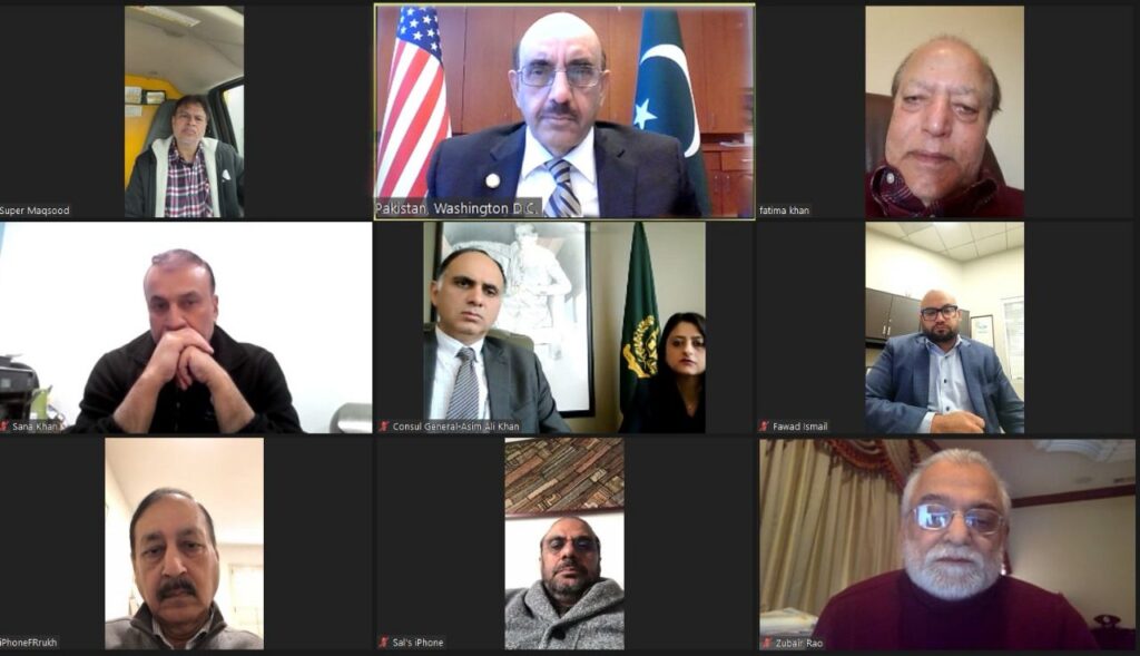 The Ambassador made these remarks during his virtual meeting with the leadership of Pakistan American Chamber of Commerce (PACC) led by its Chairman Mr. Waqar Ali Khan. Other members of the Chamber included Dr. Sana Khan, Fawad Ismail, Zubair Rao, Maqsood Chaudhry, Dr. Salahuddin and Mr. Farrukh.
