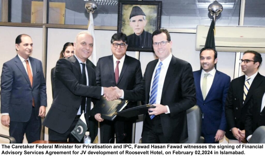 New York : A financial Advisory Services Agreement (FASA) was signed in the office of Privatisation Commission with a consortium led by Jones Lang La Salle Americas Inc (JLL) for joint venture development of Roosevelt Hotel, New York, USA, a property owned by PIAIL. The Caretaker Federal Minister for Privatisation and IPC, Fawad Hasan Fawad witnessed the ceremony. Speaking on the occasion, the Minister expressed the commitment of the Government of Pakistan to develop the historic and landmark site in the heart of financial capital of the world as an iconic structure with the most modern development features and standards. The Minister also expressed his complete confidence in the ability and expertise of the Financial Advisory Consortium to find the best possible partners and realise the maximum potential value from its development for the Government of Pakistan. In a subsequent meeting, detailed roadmap and time bound milestones were also agreed leading to identification and selection of potential joint venture partners for the project.