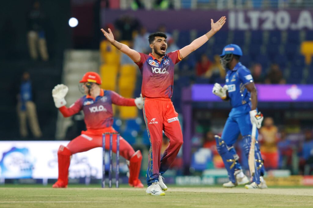 Match 24 saw Oliver Stone making his ILT20 debut for the Dubai Capitals and it was one to remember. Finishing with figures of 4 for 14 in his quota of four overs, Stone had the batters guessing throughout his spell. His first over in particular was fast bowling at its best as it had pace, swing and immaculate accuracy- the trifecta of fast bowling. Not only was it a maiden over but he also accounted for the wickets of Gulf Giants’ in-form batter Chris Lynn and Jordan Cox who was bowled by an absolute peach. He further went on to pick the wickets of Shimron Hetmyer and Jamie Overton to restrict them to 126-9.