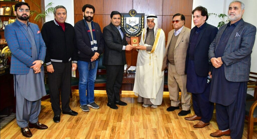 Islamabad : Ahsan Zafar Bakhtawari, President, Islamabad Chamber of Commerce and Industry (ICCI) said that Pakistan produces quality food products and Saudi Arabia is an import-based market receiving supplies from foreign markets. He said that Saudi Arabia should import agricultural products from Pakistan at competitive prices to meet the needs of its consumers. He said this while talking to Fadel Abdallah, General Manager, Al-Shaqaq Trading Est of Saudi Arabia during his visit to ICCI. Ahsan Bakhtawari said that Pakistani wheat, rice, fruits, and vegetable has great potential in the Saudi market and assured that ICCI would fully cooperate in enhancing exports of these products from Pakistan to Saudi Arabia. He said that Pakistani meat, poultry products, textiles, IT products, surgical instruments, sports goods, leather products, and construction materials can also find good a market in Saudi Arabia and stressed that Saudi Arabia should import these products from Pakistan. He said that Pakistan and Saudi Arabia should focus on further improving bilateral trade and investment relations that would create new jobs and bring prosperity to both countries. He assured that ICCI would extend all possible cooperation in developing strong business linkages between the private sectors of both countries to explore all untapped areas of cooperation. Speaking on the occasion, Fadel Abdallah, General Manager, Al-Shaqaq Trading Est of Saudi Arabia discussed the possibilities of direct import of food products, fruits, vegetables, seafood, and livestock from Pakistan. He stressed promoting direct trade between the two countries to achieve beneficial outcomes for their people and economies. Zafar Bakhtawari, former President ICCI and Secretary General UBG Pakistan said that Pakistan and Saudi Arabia enjoy exemplary cordial relations and added that both countries can further strengthen these good relations by further improving bilateral trade and economic relations. Nasir Hussain Raki Group Leader Gilgit Baltistan, Haider Raza Kazmi, Syed Javed Kazmi Group, KPK Chamber of Commerce, Muhammad Naveed Malik, and others were also present on the occasion.
