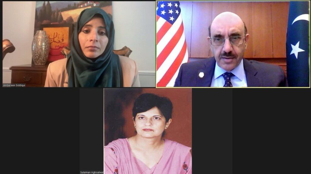 Washington DC, “HOPE Pakistan has become a beacon of hope for thousands in underserved areas of the country,” said Pakistan’s Ambassador to the United States.“We greatly commend Dr. Muniba Agboatwalla, Founder & Chairperson of HOPE Pakistan, and her team for their services to the people of Pakistan,” he said.Ambassador Masood Khan made these remarks during his e-meeting with Dr. Muniba Agboatwalla Founder & Chairperson of HOPE Pakistan and its Director Ms. Ambreen Siddiqui.He said that Pakistani philanthropic and humanitarian organizations in the United States projected the soft image of Pakistan with their selfless service to humanity.“These services strengthen the bonds of humanity and are instrumental in connecting the peoples of the two countries,” he added.The meeting was part of Embassy initiative to connect with US-based philanthropic and humanitarian organizations, manned by Pak-US nationals, and to create synergies for greater output and impact. HOPE Pakistan has established a robust network of philanthropists and donors in the United States and provides humanitarian assistance in Pakistan through interventions in health, education, and emergency relief.Briefing the Ambassador about the activities of HOPE, Dr. Muniba Agboatwalla said that the organization was working closely with UNICEF and Governments of Sindh and Punjab to provide free of cost humanitarian services especially in rural areas.Dr. Muniba said that HOPE was especially focusing on children suffering malnourishment and had catered to 900,000 children. Besides, it had also provided free treatment to over 600,000 patients focusing on maternal and child healthcare. The organization has established three formal and 200 informal school for catering to education needs of underserved areas of the country.Director HOPE Ms. Ambreen Siddiqui added that the organization was also working closely with US donors to provide clean drinking water and vocational training. HOPE provided relief goods to 150,000 flood affectees and supplied food-ration to over 30,000 people during Ramdhan.Ms. Siddiqui said that 80% of schools funded by HOPE were serving the girls of Pakistan in various parts of the country including far-flung areas.Appreciating the contributions being made by HOPE, Ambassador Masood Khan assured every possible support to the organization in its noble mission.