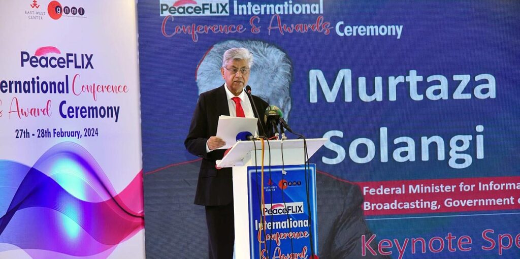 ISLAMABAD : Federal Minister for Information, Broadcasting and Parliamentary Affairs Murtaza Solangi said that the Government of Pakistan, international institutions and grassroots organizations had been contributing uniquely for promoting peace, tolerance, and harmony in the country. Delivering his speech on ” Policymaking and peace process in Pakistan” at the opening session of PeaceFLIX international conference and awards ceremony, he said in the intricate tapestry of Pakistan’s landscape, the pursuit of peace had transcended individual endeavors; it had become a shared responsibility. “We stand witness to the collective efforts of various entities that are shaping the bedrock of peace within our nation”, he maintained. “As our nation crosses the complex realms of economics, politics, and environmental concerns, the preservation of societal peace assumes paramount significance”, the minister added.Solangi said that national and international think-tanks, as well as peace organizations, had conducted invaluable research and facilitated dialogues to comprehend the nuanced dynamics of peace and conflict. He said that their endeavors extended supporting initiatives countering violent extremism, managing conflicts, and fostering a deeper understanding of conflict prevention and resolution. He opined that media houses and journalists served as potent agents of change, challenging extremist ideologies and championing inclusivity. “Their pivotal role in amplifying voices of moderation and facilitating dialogue across cultural divides is instrumental in forging connections between disparate groups”, he remarked. The minister said that in the pursuit of peace, political parties had to shoulder immense responsibility as their backing for reconciliation and mutual respect underscored the profound impact of politics in fostering peace. He said that National Counter Terrorism Authority (NCTA) stood as a cornerstone institution, coordinating nationwide counter-terrorism efforts. “The authority’s commitment to combating extremism and preserving security demonstrates a steadfast dedication to safeguarding Pakistani citizens from threats posed by militant groups,” the minister said.He said that expanding the realm of peace-builders, initiatives by the US Embassy Islamabad for sustainable peace and conflict prevention in Pakistani society were commendable. Similarly, the East-West Center, bridging the gap between the East and West, contributed significantly to peace and tolerance in Pakistani society, Solangi added. He pointed out that these organizations had catalyzed transformation within vulnerable communities in Pakistan, particularly in rural areas. The minister said that the Sustainable Development Policy Institute (SDPI), a Pakistani think tank, significantly contributed to strengthening democracy, good governance, and peace in the country. He said that another prominent Pakistani think tank, the Jinnah Institute, had conducted crucial policy research, strategic analysis, and public opinion polling related to peace and security. Similarly the Center for Peace and Development Initiatives (CPDI) had promoted transparency, accountability, and citizen participation in peace-building efforts, reinforcing the collective commitment to a harmonious society, he added.The minister said in the realm of peace-building in Pakistan, various organizations, including government bodies, civil society organizations and research institutions, had actively implemented policies and programmes aimed at promoting peace, tolerance, and harmony in the country.He said that the government institutions such as the Ministry of Interior, Ministry of Foreign Affairs, and Ministry of Human Rights had spearheaded initiatives like the National Action Plan (NAP) to counter terrorism and extremism. These policies were crucial in addressing the root causes of conflict and promoting stability within the nation, he added.”Civil society organizations play a significant role in promoting peace and social cohesion. Research institutions like the United States Institute of Peace (USIP) have been instrumental in conducting policy-relevant analytical work that contributes to a greater understanding of peace and conflict dynamics in Pakistan,” the minister said.He said that the USIP’s efforts included supporting Track 1.5 and II diplomacy between India and Pakistan to facilitate peace-building, assessing Pakistan’s counter-terrorism challenges comprehensively, and understanding violence dynamics in cities like Karachi. He said it was an honour to acknowledge the contributions of peace-builders from diverse ethnicities and cultures across Pakistan.”In the presence of international delegates, particularly from the East-West Center (EWC), we showcase Pakistan’s balanced and progressive approach toward development and stability”, he maintained. The minister said that the event served as a clarion call to both national and international peace-builders, urging them to contribute to the shared goal of fostering a society of peace. He said shifting focus to the role of government, ministries such as Interior, Foreign Affairs, and Human Rights played pivotal roles in formulating policies that promoted peace and stability. The National Action Plan (NAP), a strategic framework developed by the government, addressed terrorism and extremism by implementing measures to strengthen the criminal justice system and regulate seminaries, he added.Through collaboration with government bodies, civil society organizations, and research institutions, these policy initiatives significantly contributed to the broader peace process in Pakistan, Solangi said. “They enhance our understanding of conflict dynamics, build local capacity in conflict prevention and resolution, support innovative projects for countering violent extremism, and promote dialogue among diverse groups”, he said adding through these concerted efforts, Pakis