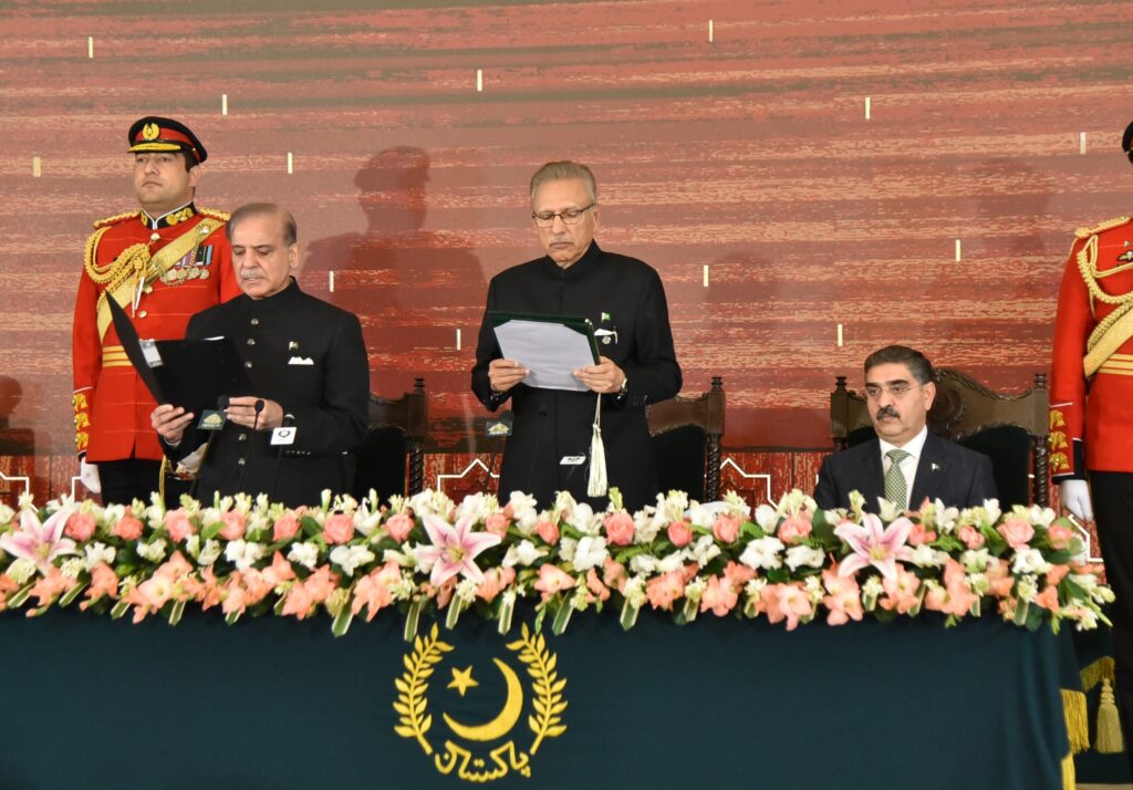 ISLAMABAD : President of Pakistan Muslim League-Nawaz Muhammad Shehbaz Sharif on Monday took the oath as the Prime Minister of Pakistan. Pakistan. President Dr Arif Alvi administered the oath of office to Shehbaz Sharif, who was elected to the country’s top office for the second time. Held at the Aiwan-e-Sadr, the swearing-in ceremony was attended by outgoing Caretaker Prime Minister Anwaar-ul-Haq Kakar and his cabinet members, parliamentarians, Chairman of Joint Chiefs of Staff Committee, services chiefs, governors, chief ministers and diplomats. PML-N Quaid Muhammad Nawaz Sharif, President of Pakistan Peoples Party Parliamentarians Asif Ali Zardari, Pakistan Peoples Party Chairman Bilawal Bhutto Zardari, other political leaders including Hamza Shehbaz, Aleem Khan, Raja Zafarul Haq, Ahsan Iqbal and Khawaja Muhammad Asif, and senior officers also attended the ceremony.