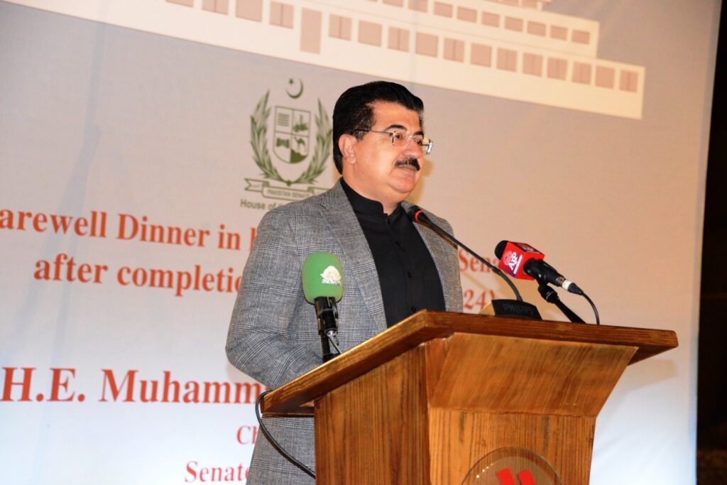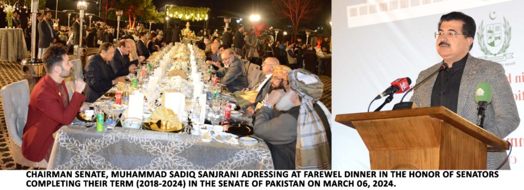 Islamabad :Chairman Senate, Muhammad Sadiq Sanjrani thanked all Senators for their unwavering commitment to the honorable conduct of the Senate, acknowledging the valuable contributions of the outgoing members. He emphasized that their efforts and services would serve as a guiding light for new members, contributing to the sustainable development of Pakistan.He expressed these views while adressing Senators at a farewell dinner hosted in honor of outgoing Senators from the Upper House of the Parliament.