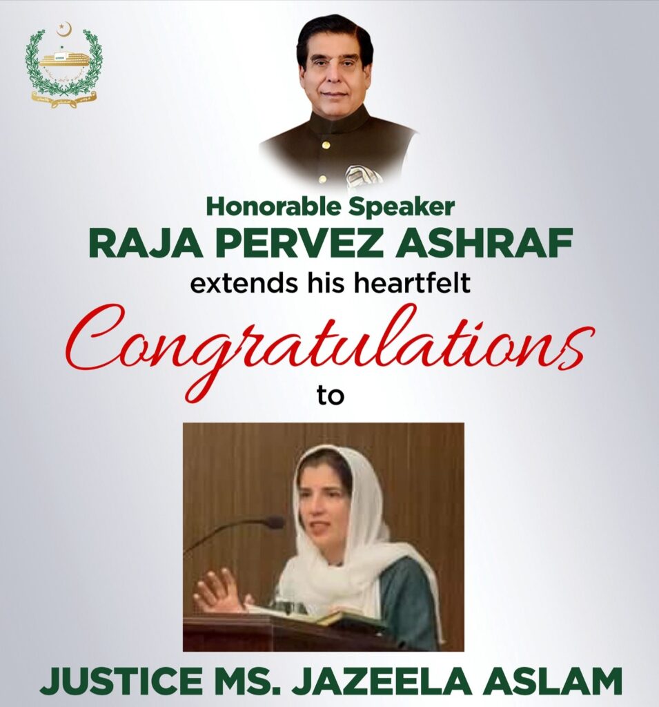 Islamabad : Honourable Speaker Raja Pervez Ashraf extends his heartfelt congratulations to Justice Ms. Jazeela Aslam on her historic achievement, as she assumes the prestigious role of the first female Registrar of the esteemed Supreme Court.